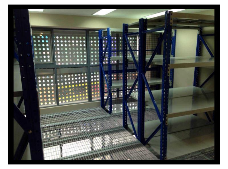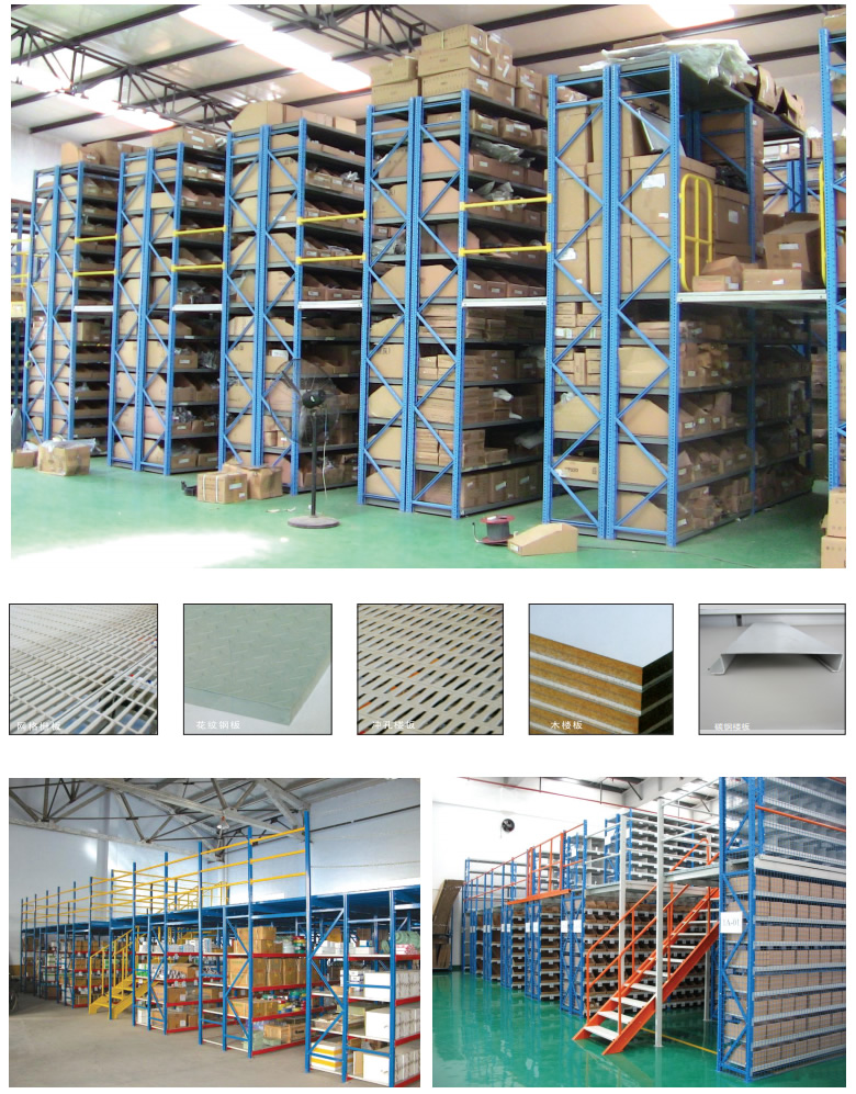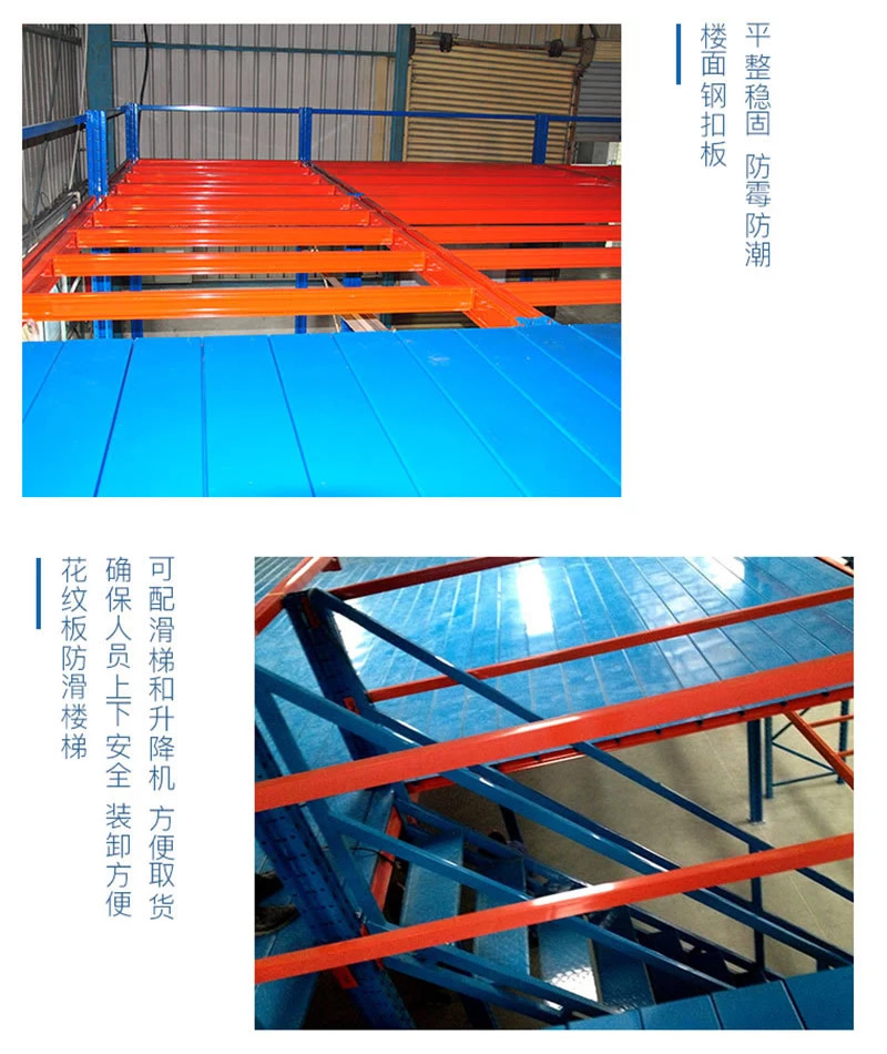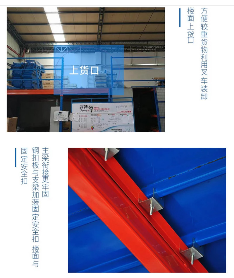 2、閣樓貨架樓面鋪設貨架專用樓板,與花紋鋼板或剛格柵相比層載能力強、整體性好、層載均勻、表面平整、易鎖定等特點。