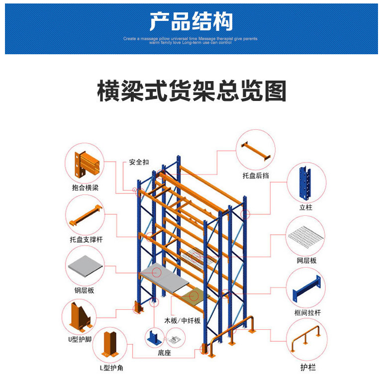 重型貨架,又俗稱橫梁式貨架,或稱貨位式貨架,屬于托盤貨架類,在國內(nèi)的各種倉儲貨架系統(tǒng)中最為常見一種貨架形式。以立柱片+橫梁形式的全組裝結(jié)構(gòu),結(jié)構(gòu)簡明有效?筛鶕(jù)存儲單元集裝設(shè)備的特性加裝如:隔檔、鋼層板(木層板)、金屬絲網(wǎng)層、倉儲籠導(dǎo)軌、油桶架等功能性附件。滿足不同單元集裝設(shè)備形式的貨物存儲。